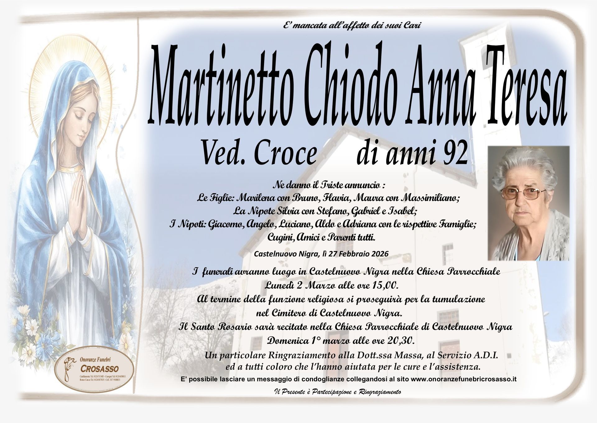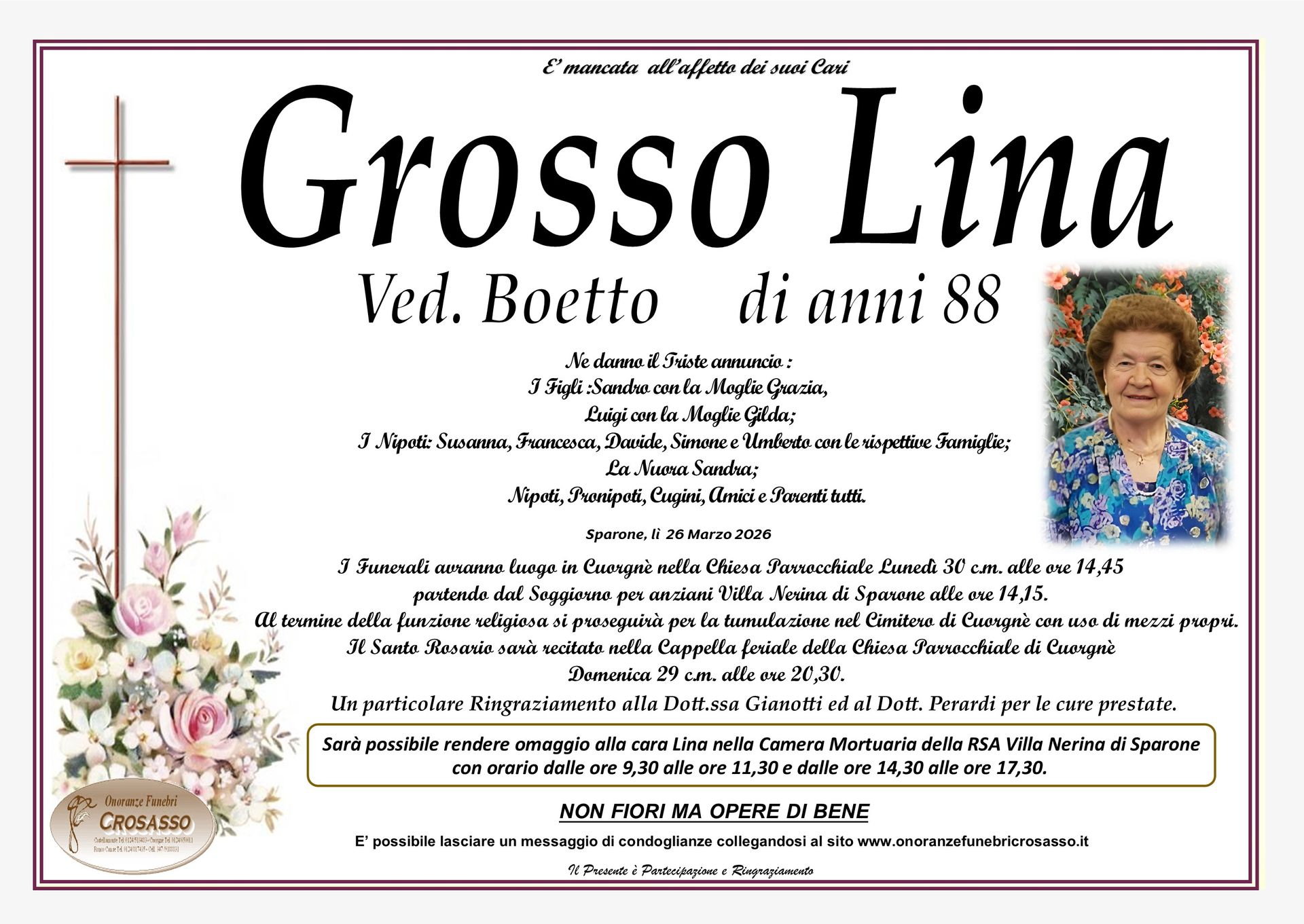 Crosasso Onoranze Funebri si occupa della redazione e della pubblicazione di necrologi, nonché nella stesura di biglietti di ringraziamento. Tramite questa sezione è possibile inviare gratuitamente un messaggio di cordoglio alla famiglia: il personale provvederà prontamente a recapitarlo.